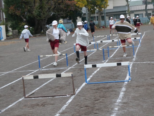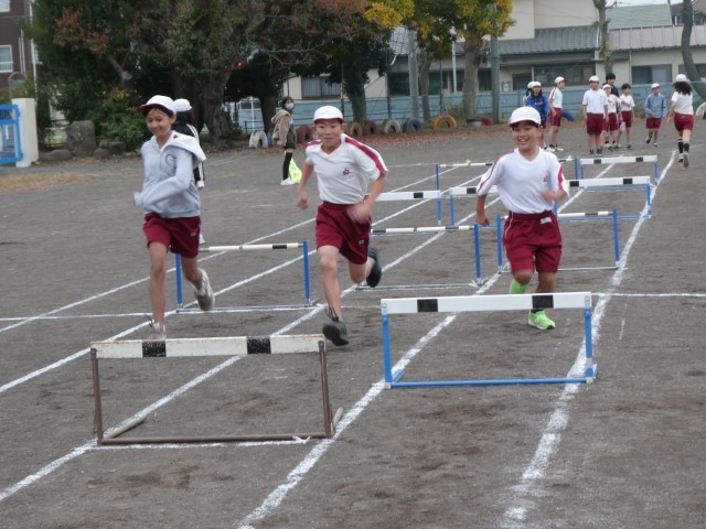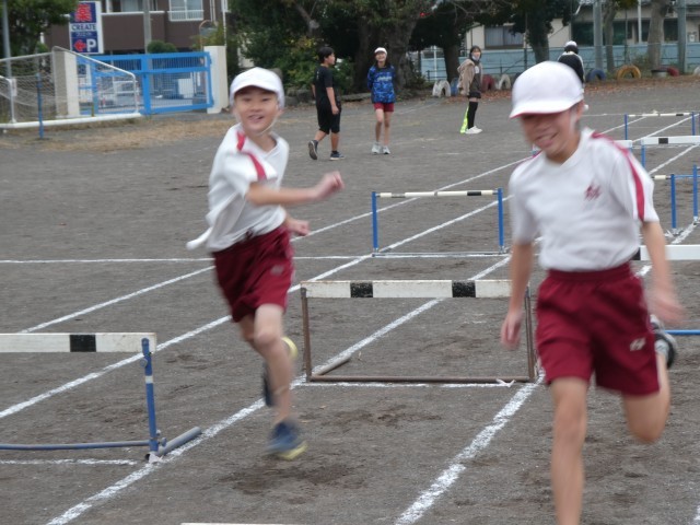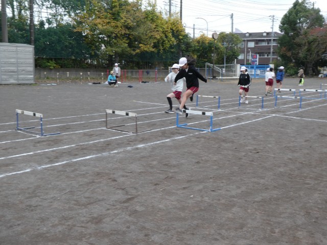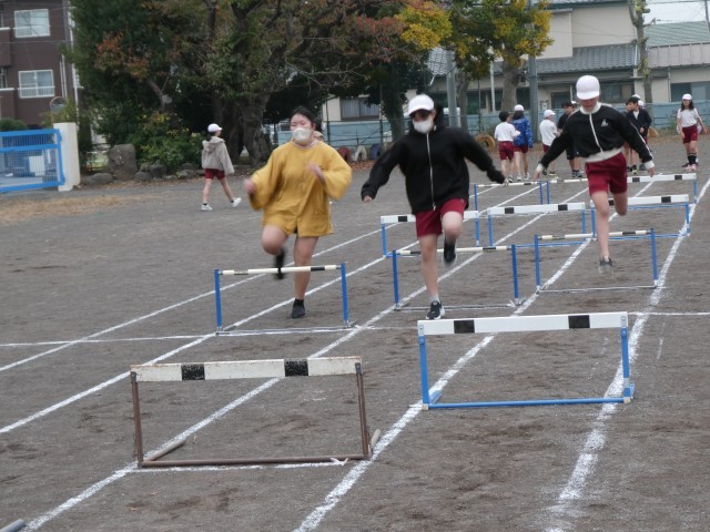 障害走に取り組んでいます。リズムよくハードルを跳び越えられるように練習しています。
