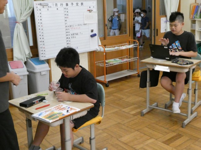 7組さんは、友達のお話を聞いて、質問をしていました。4年生は、理科の実験中でした。