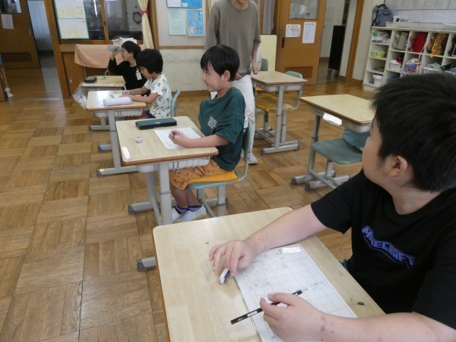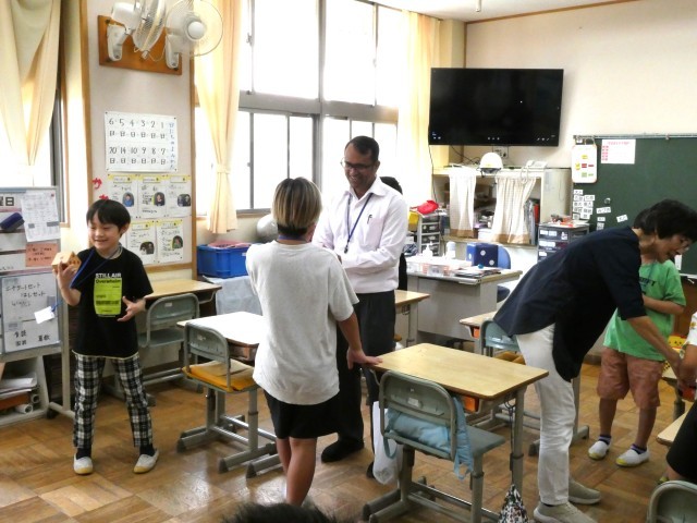 7組の1年生は、学習ゲームに負けちゃったけれど、笑顔でピース! 大きな成長ですと先生もにっこり! 6組さんでは、漢字も計算も1学期のドリルがすべて終わったよと教えてくれました。
