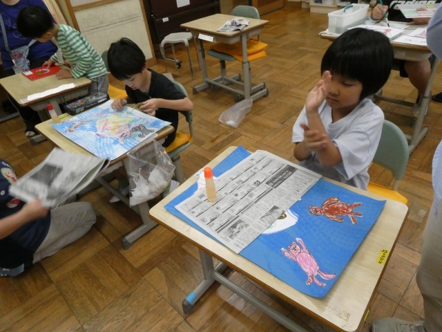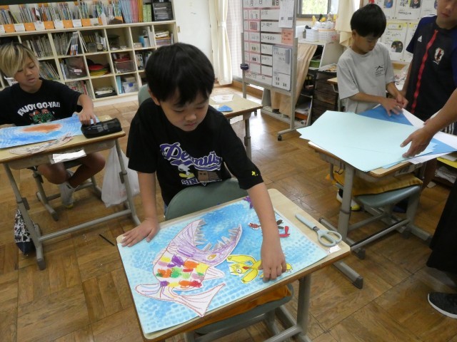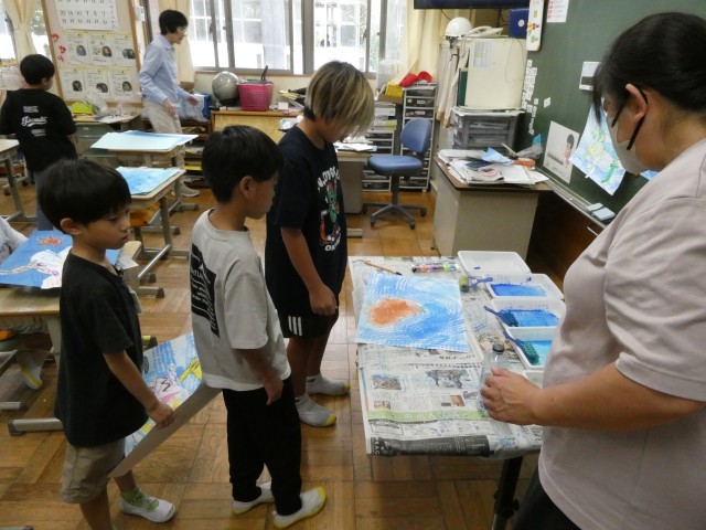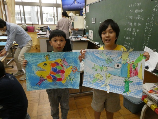 お話の絵が完成しました。海の中の水の感じをくふうして表現しています。素敵な作品ができました。