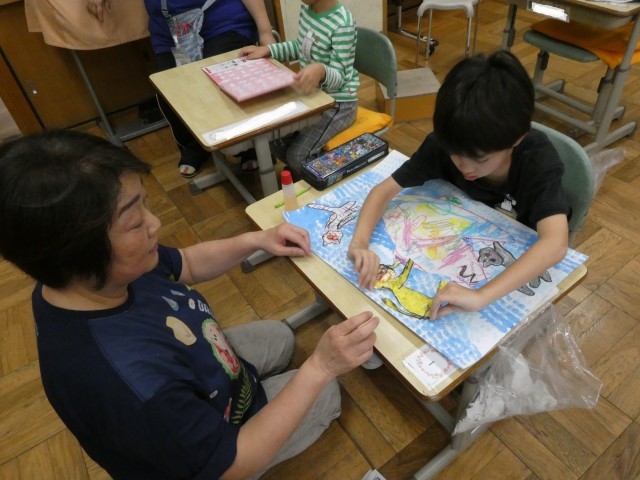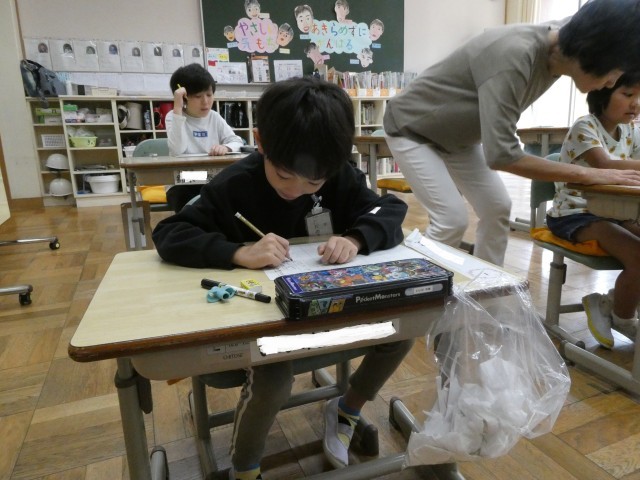 お話の絵を描いています。魚やねこの絵をはさみで切り抜いていました。はさみの使い方も勉強です。