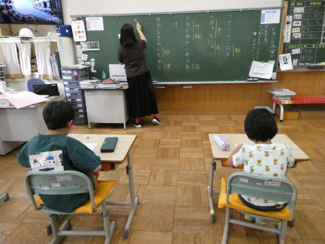 高学年は、音読からスタートしました。声がしっかり出ていてリズミカルに読むことができていました。7組の1・2年生は、絵本を読みながら具体物を動かしてとても楽しそうです。6組の1年生は、詩を読みました。先生と対話しながらじっくり学数を進めました。