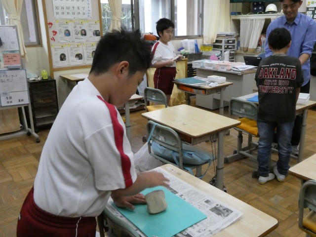 久しぶりに使う粘土、まずは柔らかくするところから始めました。力を入れてこねて、こねて、いい感じです。