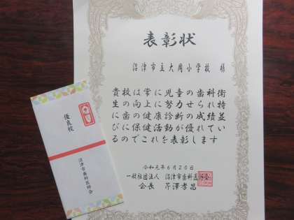 令和元年度の歯科保健優良校に選ばれました。大岡小は、永久歯の「う歯」処置完了歯率が高いということで、表彰されました。これからも歯を大切にしていきましょう。