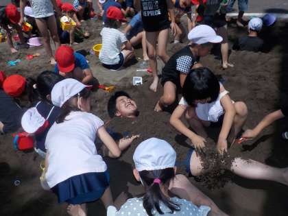 みんなで、「先生を砂の中に埋めちゃうぞー」と、大騒ぎ、すなと水とみんなとなかよく過ごせました。 -