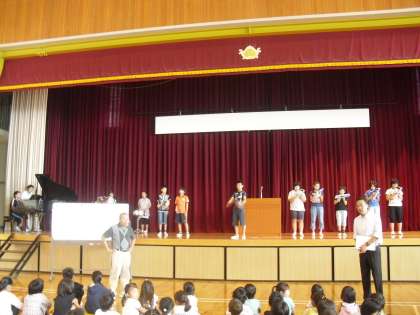みんなが集まるまで、音楽・集会委員会の子どもたちが、ビリーブを演奏しています。体育館に来た子どもたちは歌って待っています。