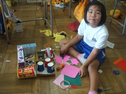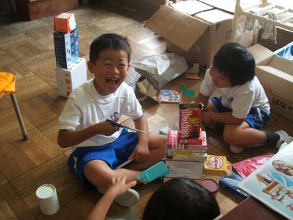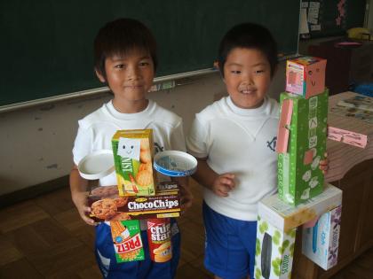 図工の学習で、箱を使った工作をしました。持って来た箱をいろいろ組み合わせて、ロボットや家などを作りました。みんなとても楽しそうに作っていました。