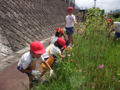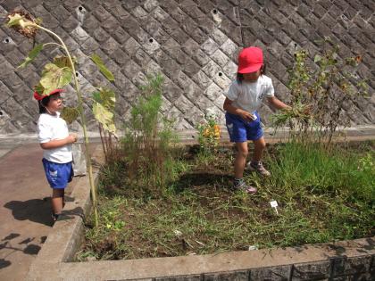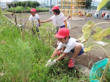 夏の間に雑草が茂ってしまった花だんを、今日はみんなできれいにしました。厳しい暑さの中でしたが、みんな一生懸命に草取りをし、だいぶきれいになりました。