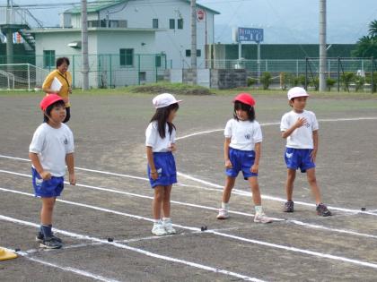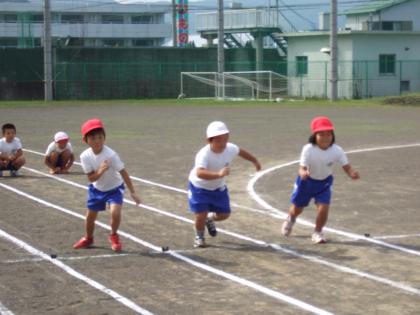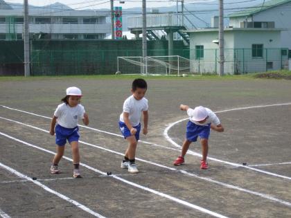 徒競走の練習をしました。名前を呼ばれたら、「はい!」と大きな声で返事をしてスタート地点につきます。「ようい、ドン!」で、元気よくスタート。ゴールをめざして力いっぱい走ります。当日もがんばります!