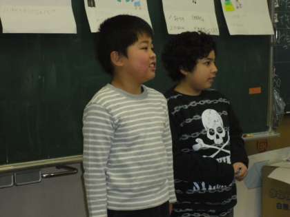 生活科の「できるようになったこと」では、漢字、冬の遊び、メロディオン、なわとび、計算カード、跳び箱と一年間でできるようになったことを発表しました。