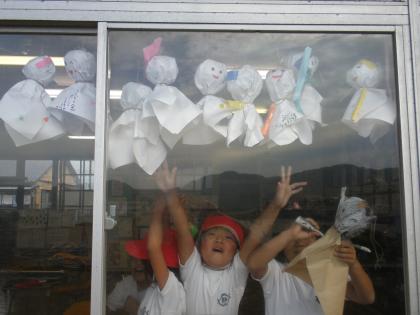 運動会が成功するよう願いを込めて作ったてるてるぼうず。願いが届いたようで、今日はいいお天気になりました。今日一日、今までの練習の成果を発揮してほしいと思います。