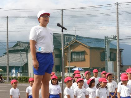 開会式では、最後の運動会を迎えた6年生が児童会長として全校児童にむけて立派に話をしました。また、初めての運動会を迎えた1年生の3人がしっかりとした態度で自分のめあてを述べることができました。