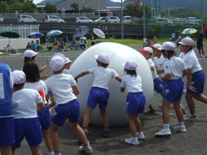 午前中最後の種目は全校児童による「ころ☆転☆コロ」(大玉転がし)です。スタートからアンカーまで大接戦の大勝負でした。仲間と力を合わせながら子どもたちみんなが楽しそうに、でも必死になっている姿に感動しました。