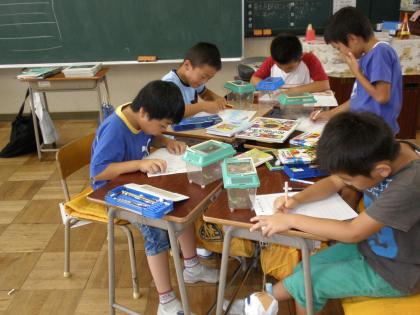 生活科の授業で、校庭の虫の観察をしました。大きなバッタやトンボを捕まえ、図鑑などで名前を調べました。虫たちをよく観察し、気づいたことなどカードにまとめました。