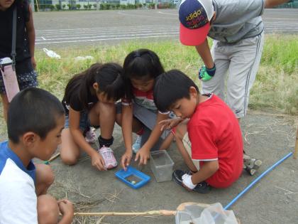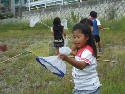 理科で生き物さがしを行いました。学校南の消防署付近で、トンボ、ちょうちょ、バッタを捕まえて大喜びの子どもたちでした。