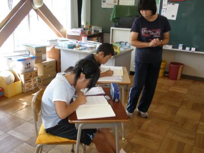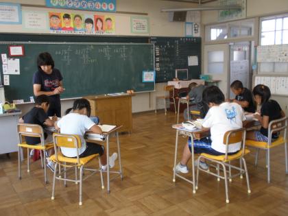 4年生の算数の授業では、わり算の学習をしていました。みんな真剣に問題に取り組んでいました。