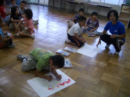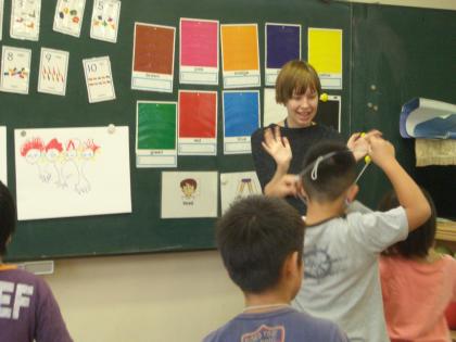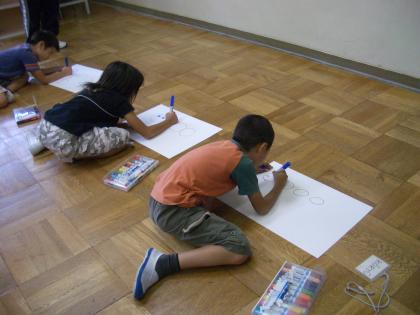 今までの復習を兼ねて、モンスターを書きました。4人ずつ、3チームに分かれて先生が、「four,blue,heads」というと4つの青い頭を書きます。数・色・体の部分の復習を楽しみました。