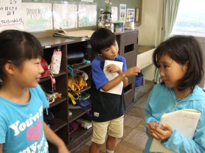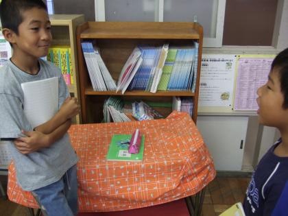 新聞作りには、見たり聞いたりしたメモが必要です。今日はメモの取り方について、インタビューの仕方を学習していました。子ども同士でインタビューの練習をしていました。