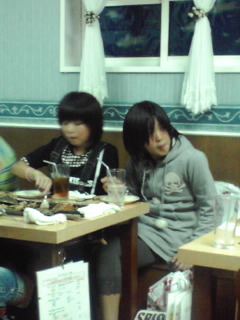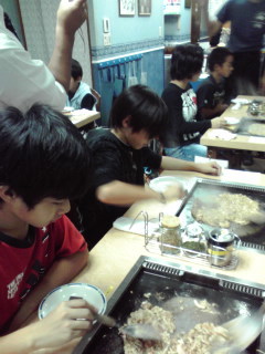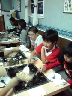 昼御飯です。お店の方に教えて頂きながらもんじゃ作りに挑戦!自分たちで作ったもんじゃは美味しいようです。