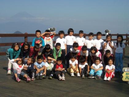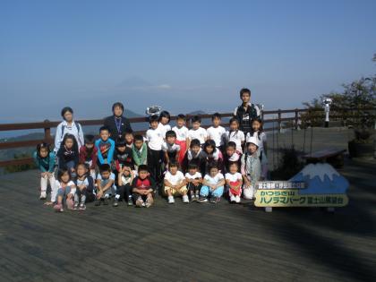 ロープウェイで山の上に到着して、富士山をバックに、東小のお友だちと一緒に記念撮影をしました。この後、一緒に秋探しをしたり、アスレチックで遊んだりしました。