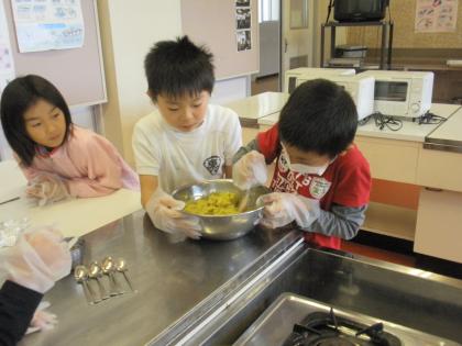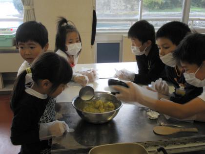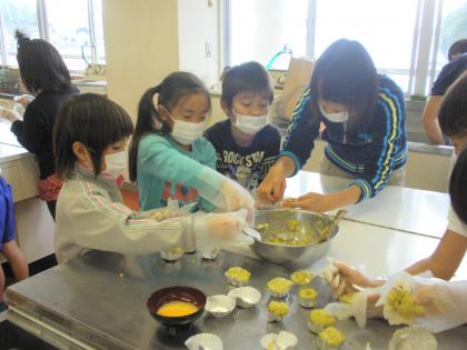 グループで協力して、スイートポテトを作りました。卵黄と牛乳を混ぜて、アルミホイルに分けて、形を整えました。出来上がりが楽しみにしながら作業をしました。