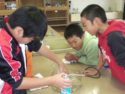 6年生は、理科「水溶液の性質」で、ペットボトルの水に二酸化炭素を溶かし、炭酸水作りを行いました。