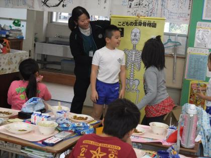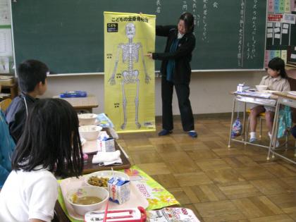 今日は静浦東小より宮脇栄養士が来校しました。各クラスで子どもたちの給食の様子を見て回りました。また、宮脇栄養士は、全身骨格図を使用し、骨を丈夫にするためには、何でもよく食べることが大事だということを話しました。