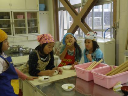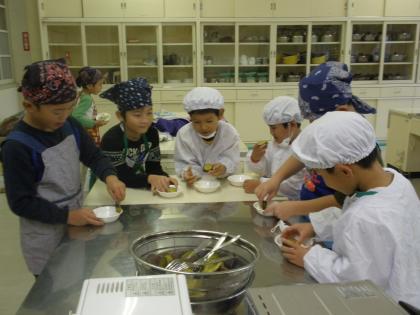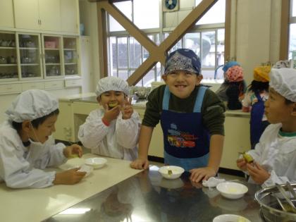 初めは、ふかしたさつまいもにバターをつけて食べました。「あま〜い。」「おいしい。」みんな笑顔でおいしくいただきました。
