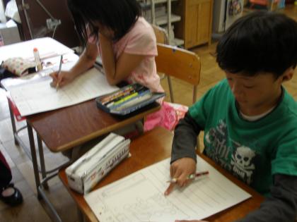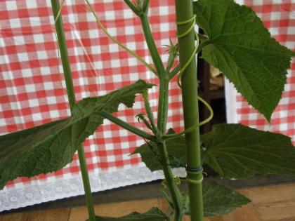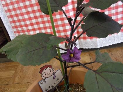 「ひまわりさん」のなすときゅうりが育ってきました。ナスには紫色のきれいな花が、きゅうりにはかわいい実がついています。