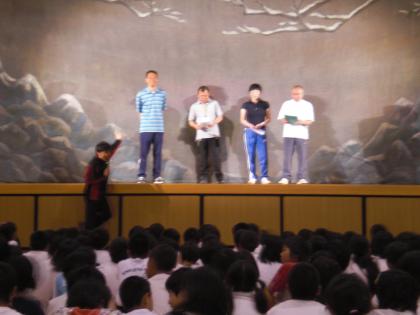 第1部 演劇教室です。先生・児童が舞台に上がり、基礎訓練、そして朗読劇に挑戦です。