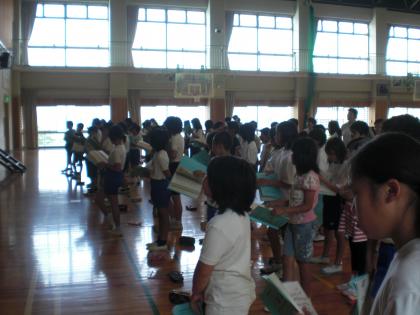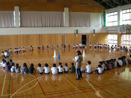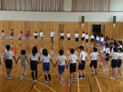 体育館にて、自然教室(キャンプファイヤー)の練習をしています。