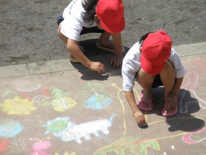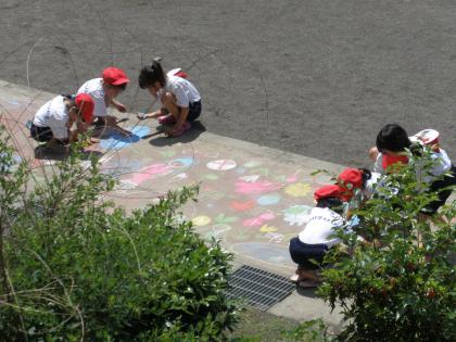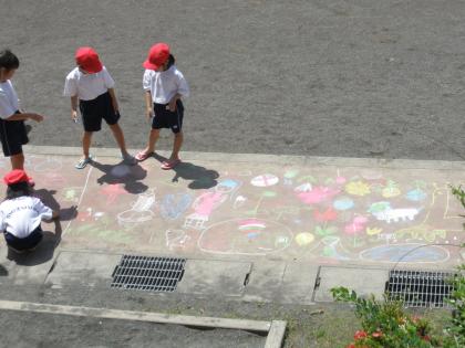 1年生は、校庭の通路にチョークで絵を描いています。鮮やかな色で、大きく伸び伸びと描いていますね。