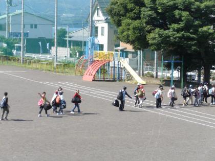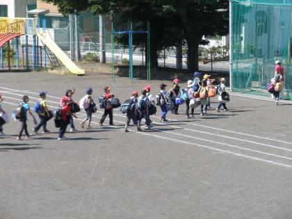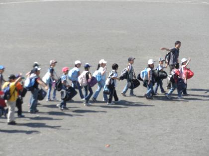 学級ごとに出発します。校舎のベランダからは、下級生が「いってらっしゃ〜い!」、4,5年生も、「行ってきま〜す!」と手を振って出発していきました。