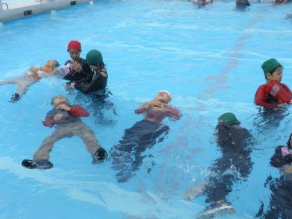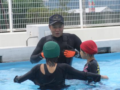 子どもたちの日常生活の中で、万が一、服を着て靴も履いたまま川や海に落ちたら、大変です。水着のときと違って動きが自由にならず、パニックになってしまうでしょう。今日は、そんな場合を想定して、まずは背浮き、次ぎにペットボトルを使ったり着衣に空気を入れたりして浮く方法を教えていただきました。