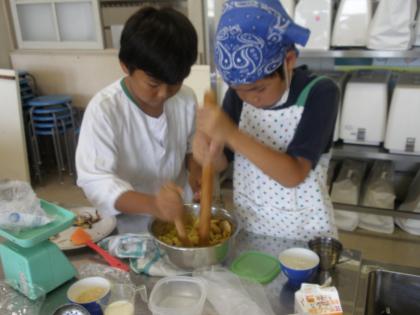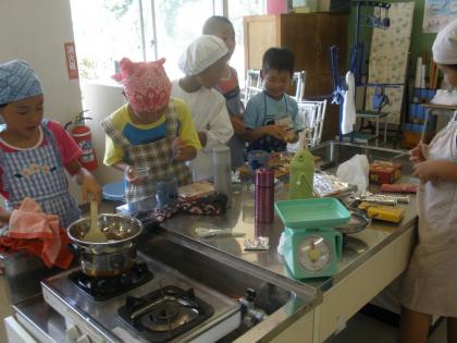 カルメ焼きはなかなかふくらまず、サツマイモの皮むきは手が熱く、クレープはうまく裏返せず…。それでも、班のみんなで協力して、和気あいあい、作っています。