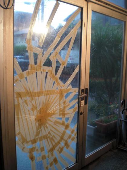昨日台風9号の突風で、職員玄関ガラスが・・・