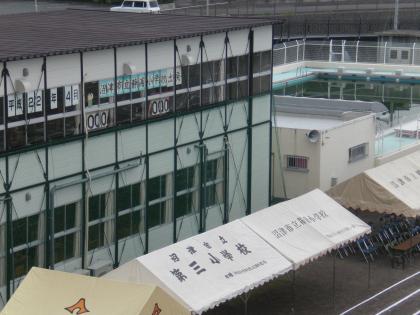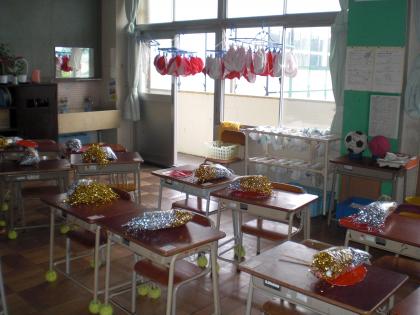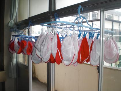 テントは他校からも借りてきました。 1年生の教室の洗濯された赤白帽など準備が整っています。