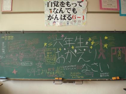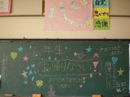 6年生の修学旅行が、15日(金)終了しました。5年生が、6年生教室黒板にお迎えの言葉が書かれていました。これから、静浦小の伝統になっていくといいなっと思いました。