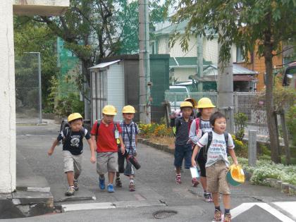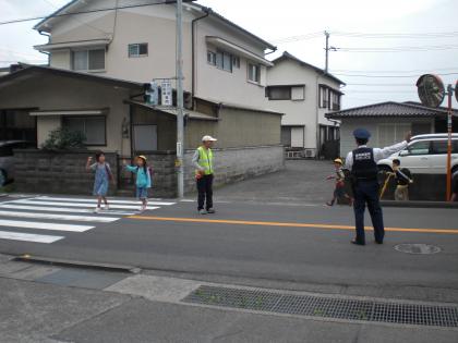曇り空ですが、児童は元気に登校です。