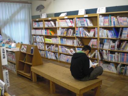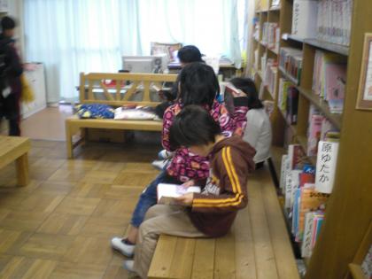 運動場は、小雨でなわとびもできません。図書館で読書する児童もいます。