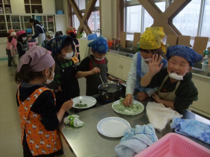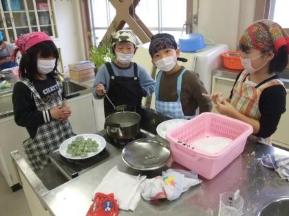 こねた団子のもとを思い思いの形にして、ゆでています。湯気は熱いけれど、みんなで代わりばんこに混ぜたり浮かび上がってきた団子をすくったり、協力して作っています。