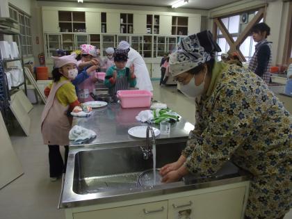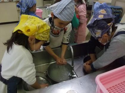 洗い物もがんばります。ボールやおなべにこびりついた団子の粉は、なかなか落ちないので大変です。小さな手に力を込めて洗っています。