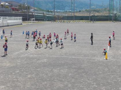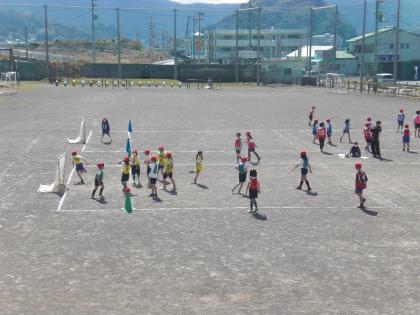 暖かい日差しの中で・・・ラインサッカーの授業です。