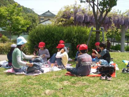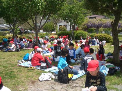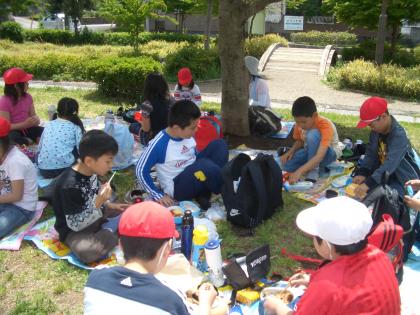 縦割りグループごとに、歩いたり整列したりお弁当を食べたりしました。