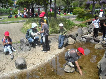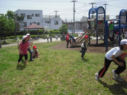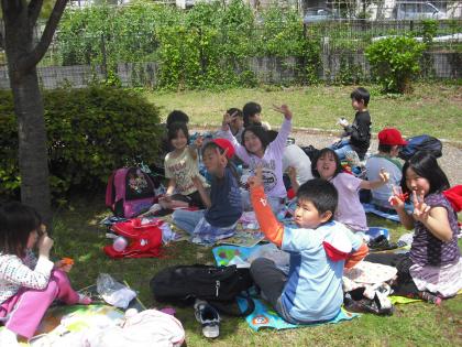 3・4年生縦割りグループでせせらぎ公園まで歩いていきました。往復11.4キロメートルをがんばって歩きました。公園では、縦割りでお弁当を食べたり遊んだりしました。