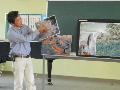 今日は、1・2年生に静浦漁業協同組合より小柴さんを講師に迎え、漁法や静浦の海にいるさかなのお話を聞きました。お話の後質問がたくさんでました。小柴さんありがとうございました。