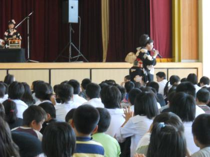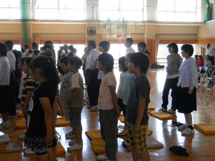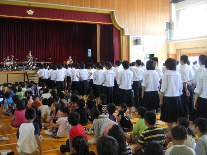 1年生笹原さんがステージへ、そして静浦小校歌・静浦中校歌を演奏し児童生徒も演奏に合わせて歌いました。