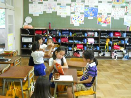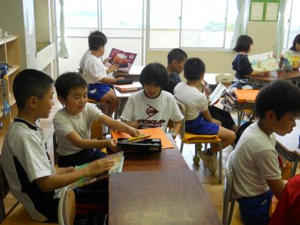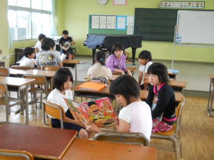 6年生と1年生・5年生と3年生・4年生と2年生です。上級生が読み聞かせをしています。