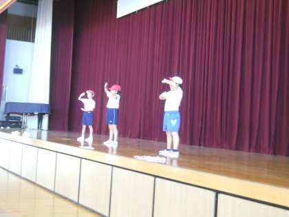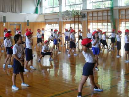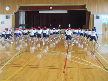ステージに児童のソーラン節先生が見本となり、3・4年生がソーラン節の練習が行われていました。