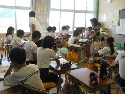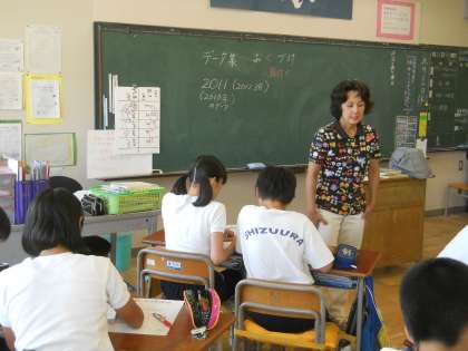 学校司書による「朝日ジュニア年鑑」を、活用しての調べ学習の進め方について学習しています。